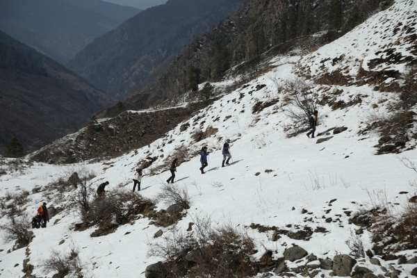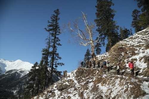Starting off, we will make our trek to Puani Garaat starting off at Taluka. It is the first day of walking, so we will keep it easy, acclimatising and enjoying the natural scenery around. This route runs through the thickly wooded areas that are rich with chestnut, chinar and walnut trees with the waterfalls rushing parallel and the singing of birds in the cool refreshing air.