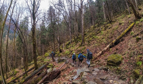 We start our downhill ascent to the Puani Garaat campsite after a warm cup of tea in the morning. The path is steeply descending in the dense coniferous forests, and everything is full of the smell of pine and sounds of nature.