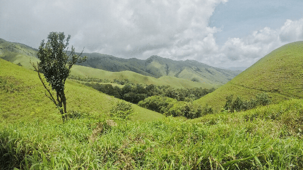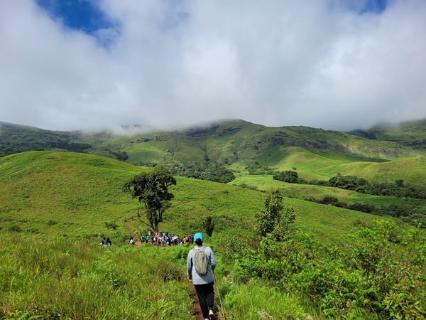 The trek to Kudremukh starts at the Forest Department Office. Our trek leaders shall now brief you about the entire Kudremukh Trail and specific tips on ascending and descending. At the beginning itself, after a few minutes of walking, there will be a stream crossing, a slight ascent on a muddy path surrounded by ferns, several shrubs, and lush green grass. This continues for around 1 to 1.5 km, and then there comes an elevated plain and a stand-alone tree called Ontimara (Lonely Tree), our first milestone.