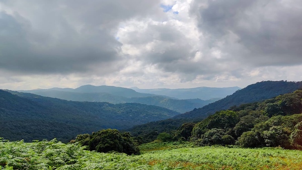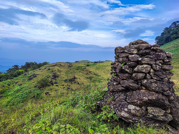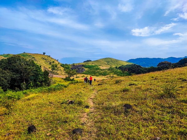 Soon, the path leads us into the shola forests, a shaded green canopy alive with birds and jungle sounds. For the next 2 km, the forest trail keeps the trek pleasant and cool, with soft forest floors making it easier on the feet. As the trees clear out, the landscape transforms into vast rolling grasslands. This 3 km stretch involves a steeper climb, testing endurance but offering spectacular views of the valleys and the Western Ghats all around.